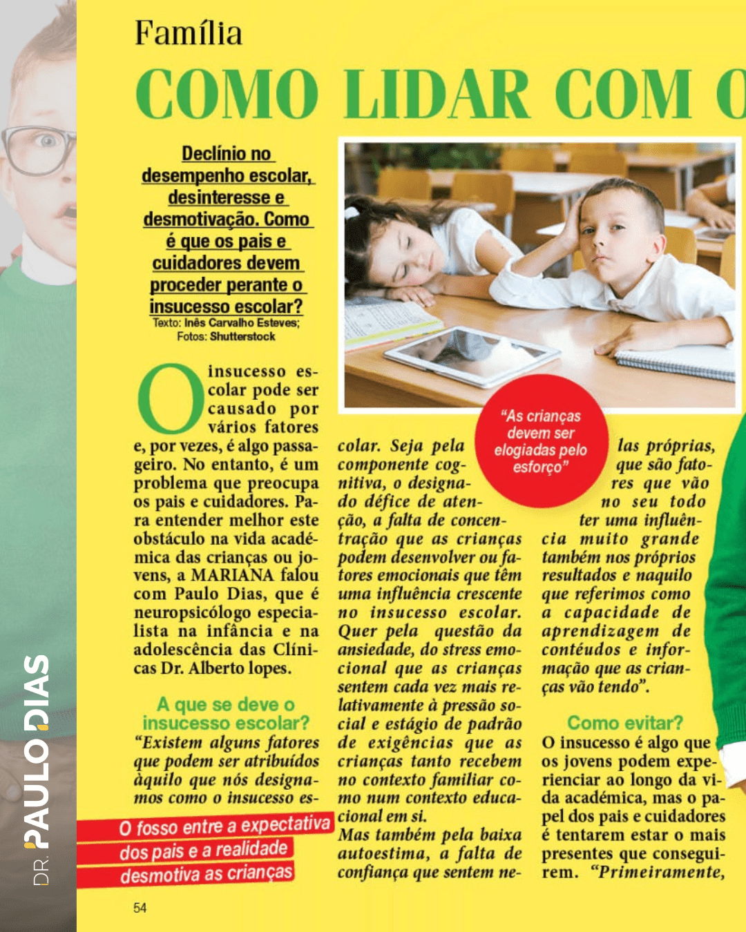 21Jan21 Janeiro, 2024Declínio no desempenho escolar, desinteresse e desmotivação. Como é que os pais e cuidadores devem proceder perante o insucesso escolar? Paulo Dias2024-01-21T19:57:05+00:00Como lidar com o insucesso escolar?Leia a minha entrevista publicada na revista Mariana. Compartilhar esta publicaçãoFacebook Twitter LinkedIn Pinterest Email WhatsAppDeixe um comentário Cancelar respostaO seu endereço de email não será publicado. Campos obrigatórios marcados com *Comentário *Nome * Email * Site Guardar o meu nome, email e site neste navegador para a próxima vez que eu comentar.Please enter an answer in digits:17 + 7 =
